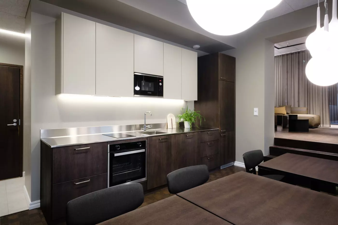 Projektin aikana hoidimme suunnittelun lisäksi kalusteiden ja tuotteiden kilpailutukset sekä tilaukset työmaan aikataulun mukaisesti. Kommunikoimme läpi projektin osapuolten välillä ja kävimme rakentajien kanssa keskustelua mahdollisimman kustannustehokkaasta toteutuksesta visuaalisuudesta ja toiminnallisuudesta tinkimättä.