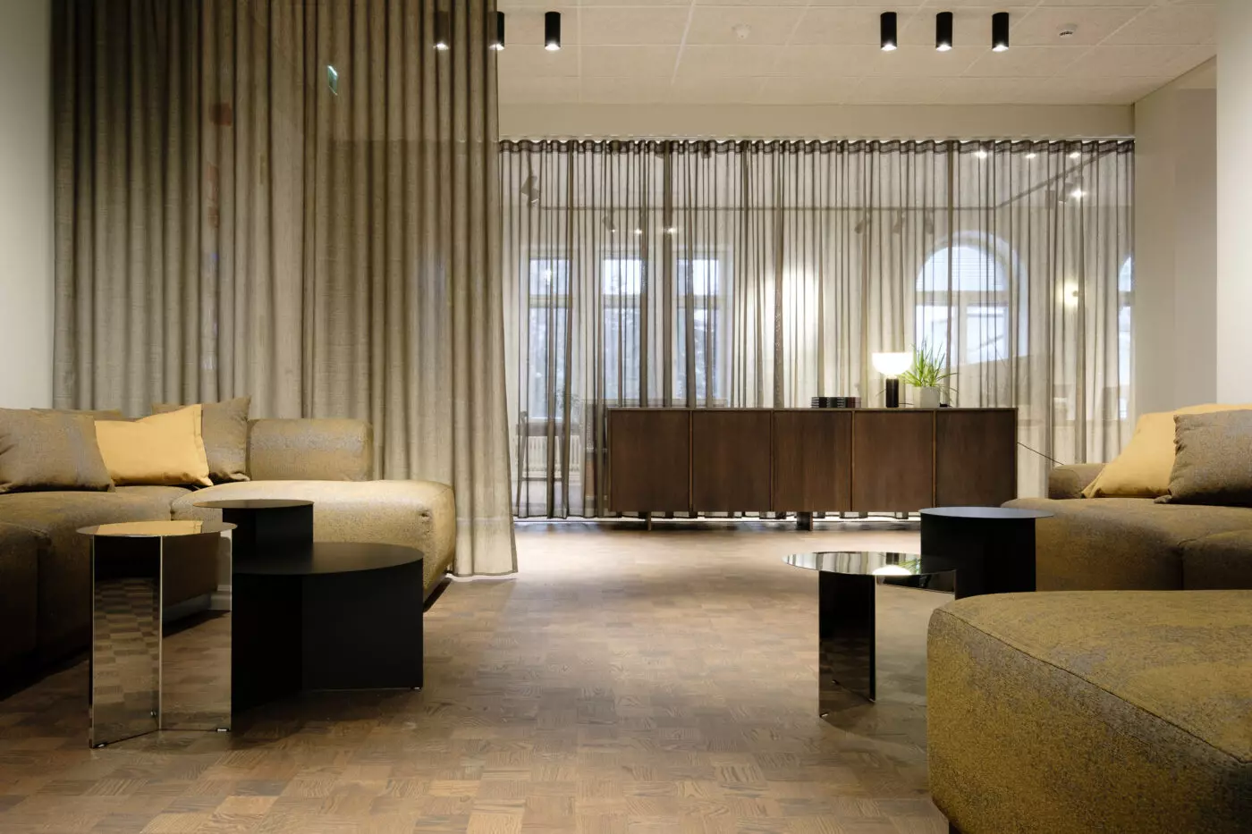 Suunnittelimme tilaratkaisua yhdessä asiakkaan kanssa ja jatkoimme tilan visuaalisen konseptin suunnittelua yhdessä Sari Matikan kanssa kanssa aina pintamateriaaleihin, kalusteisiin ja valaistukseen saakka. Suunnittelimme yhdessä mittatilauskalusteita, mm. sohvat, säilytyskalusteet ja yksityiskohdin viimeistellyt työpöydät. Tiloja ja eri vyöhykkeitä rajataan eri materiaaleilla ja muunneltavilla verhoratkaisuilla.